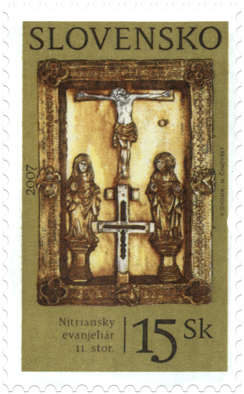© Slovenská pošta, a .s., 2007 Nitriansky evanjeliár sa považoval za najstaršiu zachovanú knihu vyhotovenú na Slovensku, a to pred rokom 1083. Ide o liturgickú knihu, obsahujúcu výňatky z evanjelií, čítané počas nediel a sviatkov cirkevného roka. Z pôvodných 54 pergamenových fólií s rozmermi 285x195 mm sa zachovalo 50. Fólie sú zviazané a vložené do hrubých drevených dosiek, obtiahnutých tmavočerveným zamatom. Na prednú dosku bol v 14. až 15. storočí pripevnený hlboký strieborný pozlátený reliéf, ktorý zobrazuje aj prezentovaná poštová známka. Reliéf znázorňuje ukrižovanie Krista s postavami Panny Márie a sv. Jána stojacimi na podstavcoch. Na kríž v dolnej časti nadväzuje...