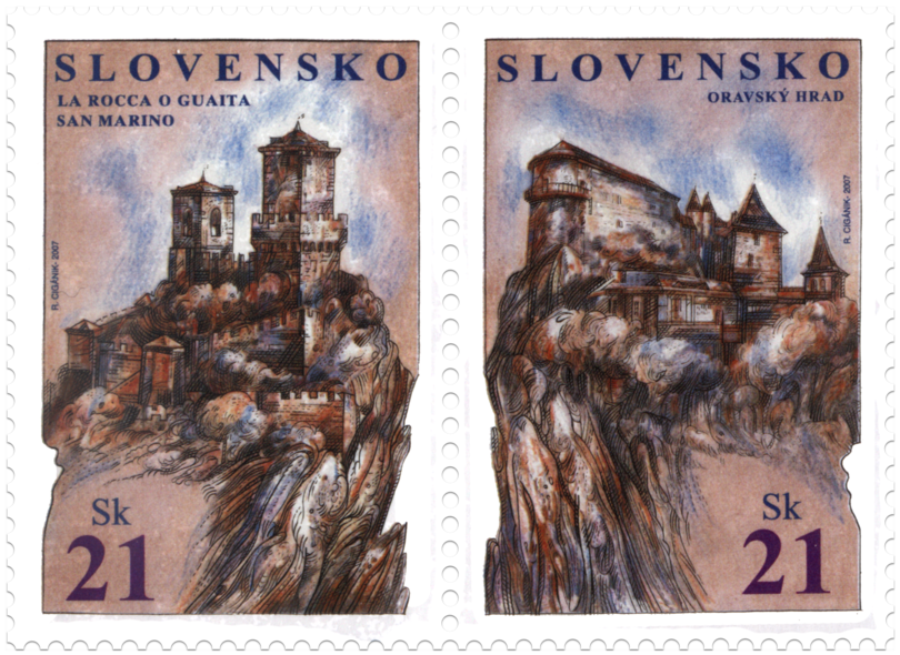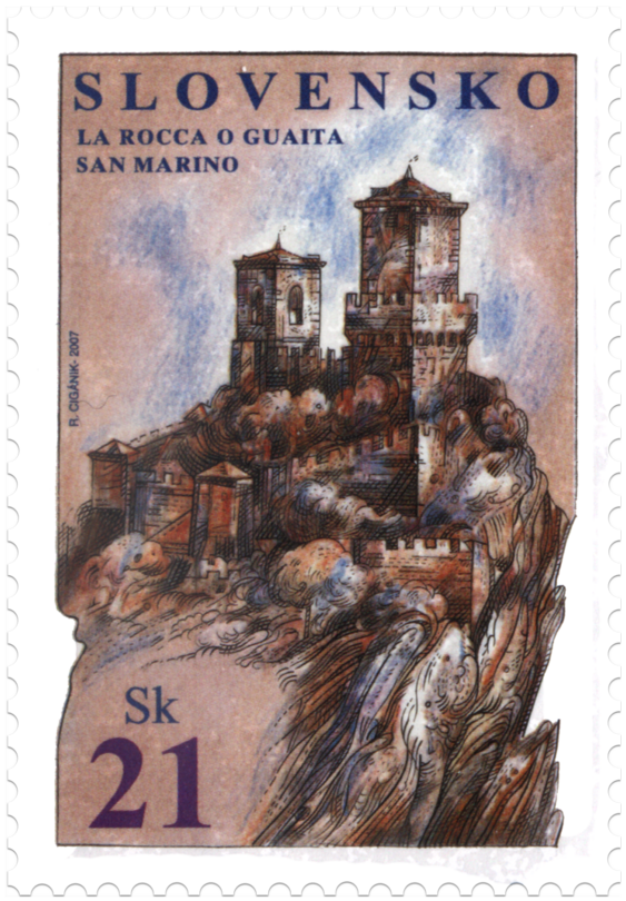 © Slovenská pošta, a . s., 2007 Po prejdení Contrada dei Magazzeni alebo Contrada dei Fossi rýchlo dosiahneme nadmorskú výšku 751 m, odkiaľ máme neobmedzený výhľad do okolia. Opevnené jadro Prvej veže s päťuholníkovým základom spočíva priamo na skale a je považované za jednu z najstarších talianskych veží (datovanú do 11. storočia). Pozostáva z centrálnej bašty a dvoch oblúkov, pričom vonkajšia stena jedného z oblúkov dekorovaná cimburím je zvyškom pôvodného obranného múru. Naproti vstupu, na malom námestí, môžeme obdivovať sochu B. Marabiniho a delá, ktoré venovalo Švajčiarsko Republike San Marino v roku 1989. Kedysi bol na vchode umiestnený erb republiky, pochádzajúci...