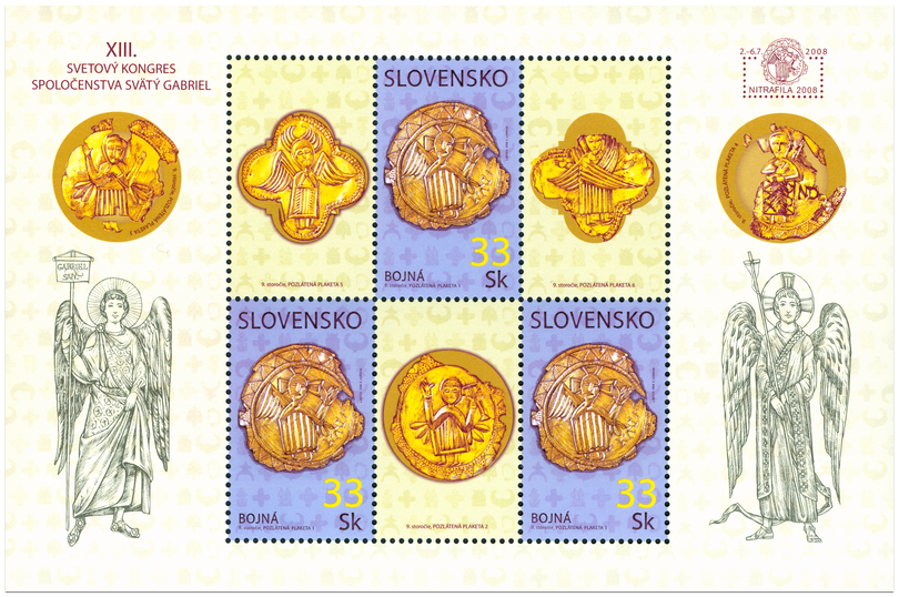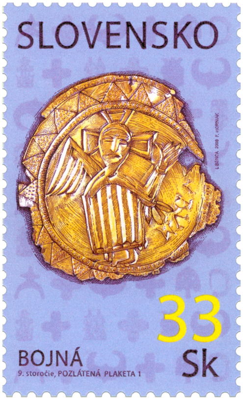 Medené, pozlátené plakety s priemerom od 13 do 15 cm objavené na hradisku Bojná I. - Valy patria medzi najvýznamnejšie objavy veľkomoravského umenia 9. storočia. Všetkých 6 plakiet je zdobených figurálnou výzdobou a na dvoch z nich sa nachádzajú unikátne nápisy v gréckej či latinskej majuskule. Na známke je zobrazená plaketa č. 1 s okrídleným Kristom „Anjelom veľkej rady“, ktorý je zriedkavým ikonografickým typom. Jeho najstaršie známe zobrazenie pochádza z iluminovaného rukopisu Homílie Gregora Naziánzskeho (Bibliothèque nationale Paris, Gr. 510), ktorú nechal vyhotoviť konštantinopolský patriarcha Fótios pre byzantského cisára Basilea I. v rokoch 880 - 886. Na kupónoch sú prezentované ostatné...