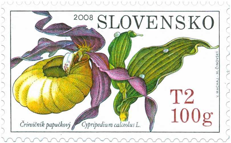 Označenie T2 100g zodpovedá tarife pre list 2. triedy do 100 g v tuzemskom styku. © Slovenská pošta, a . s., 2008 Tento rod je na území Slovenska zastúpený len jedným druhom, ktorý zároveň predstavuje v slovenskej flóre aj jediného zástupcu z podčeľade Cypripedioidae. Ťažisko rozšírenia má tento rod najmä v Ázii a Severnej Amerike kde sa vyskytuje okolo 20 druhov. C. calceolus je do 60 cm vysoká rastlina s plazivým podzemkom. Z podzemku vyrastá stonka s 3-5 striedavými, 4-7 cm širokými, kopijovitými listami, na ktorej sa vytvára od mája do júna väčšinou len jeden kvet (zriedkavo môžu byť dva, alebo...