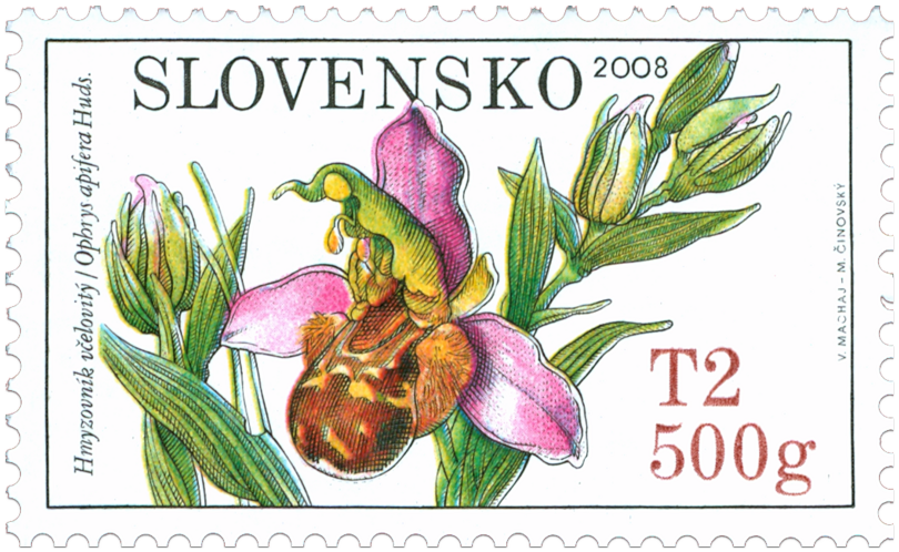 Označenie T2 500g zodpovedá tarife pre list 2. triedy do 500 g v tuzemskom styku. © Slovenská pošta, a . s., 2008 Rod Ophrys zahŕňa okolo 70 druhov, ktoré sú rozšírené prevažne v oblasti Stredomoria, odkiaľ zasahujú aj do juhozápadnej Ázie. Na území Slovenska je tento rod zastúpený 5 druhmi, ktoré patria medzi najvzácnejšie druhy orchidejí. Rastlina má guľovité hľuzy z ktorých vyrastá prezimujúca prízemná ružica sivozelených kopijovitých listov. V júni až v júli sa začnú vo vrcholovej časti stonky objavovať nápadné kvety, ktorých môže byť 3 až 10. Kvitnúca rastlina sa stala aj námetom pre emisiu známky. Zaujímavé je, že...