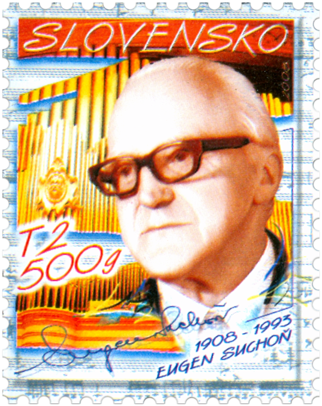 Označenie T2 500 g zodpovedá tarife pre list 2. triedy do 500 g v tuzemskom styku. © Slovenská pošta, a . s., 2008 Prof. Eugen Suchoň (25.9.1908 Pezinok – 5.8.1993 Bratislava) – slovenský hudobný skladateľ, pedagóg a teoretik, jedna z najvýznamnejších osobností zakladateľskej generácie slovenskej hudobnej moderny. Študoval na Slovensku a v Čechách hru na klavíri, kompozíciu a dirigovanie. Suchoňovo kompozičné dielo je rozsiahle, zahŕňa skladby pre sólový klavír –Baladická suita (1936), Malá suita s passacagliou (1931), Metamorfózy (1952), Toccata (1973) a Elégia (1978) – i pre rôzne komorné zoskupenia (Poème macabre pre husle a klavír, 1963). K vrcholom jeho inštrumentálnej...