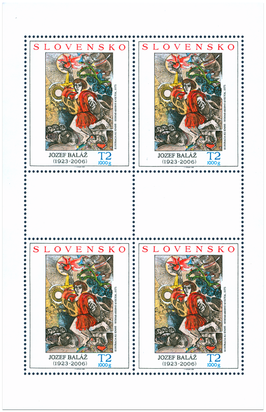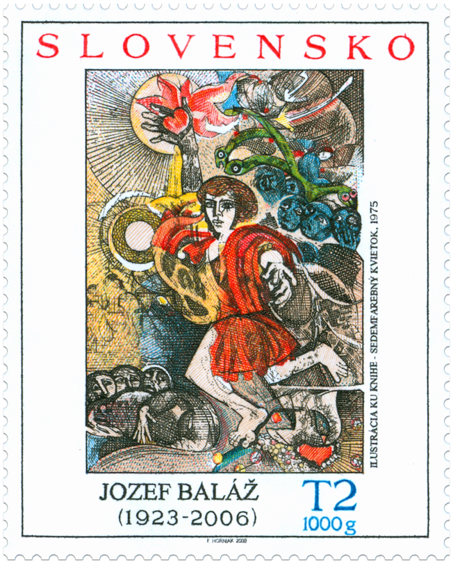 Označenie T2 1000g zodpovedá tarife pre list 2. triedy do 1000 g v tuzemskom styku. © Slovenská pošta, a. s., 2008 Jozef Baláž (14. 3. 1923 – 6. 7. 2006) akademický maliar, grafik, ilustrátor, nestor slovenskej známkovej tvorby, zaslúžilý umelec, významná osobnosť slovenského umeleckého a kultúrneho života. Odchovanec osobností slovenského výtvarného umenia Jána Mudrocha, Gustáva Mallého, Jozefa Kostku, Kolomana Sokola a Dezidera Millyho ukončil v roku 1954 štúdiá na Akadémii výtvarných umení v Sofii u profesora Ilju Beškova. Vyzretým umeleckým prejavom vstúpil do výtvarného diania. Stal sa členom tvorivých skupín Život a Klub grafikov. Bol Čestným členom Zväzu bulharských výtvarných umelcov...
