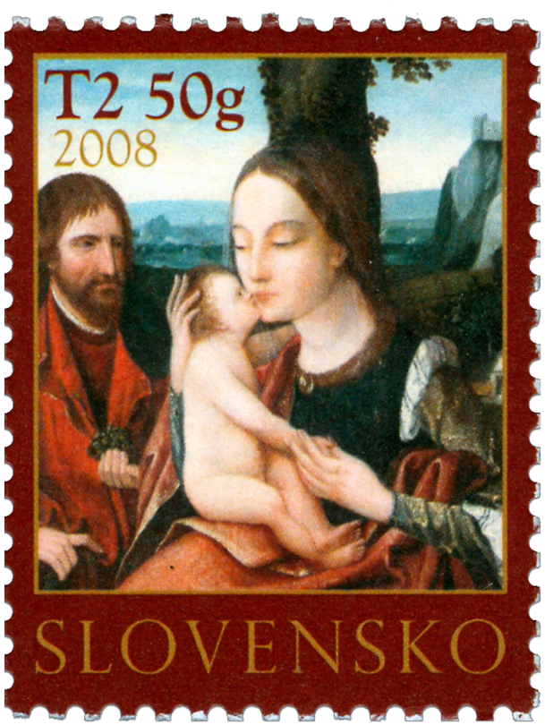 Označenie T2 50 g zodpovedá tarife pre list 2. triedy do 50 g v tuzemskom styku. © Slovenská pošta, a . s., 2008 V čase Božieho hodu vianočného prezentuje Slovenská pošta, a.s. na poštovej známke zaujímavú pamiatku flámskeho maliarstva pol. 16. storočia, obraz s motívom Svätej Rodiny zo zbierky SNG. Pamiatky nizozemského a flámskeho maliarstva 16. storočia, nachádzajúce sa v súčasnosti v slovenských múzeách a galériách, tvorili pôvodne súčasť zbierok miestnej šľachty a bohatých podnikateľov, nakoľko holandské maliarstvo bolo v minulosti veľmi oceňované najmä sofistikovanými zberateľmi z radov miestnych priemyselníkov. Tak je tomu i v prípade obrazu Sv. Rodiny od Antverpského...