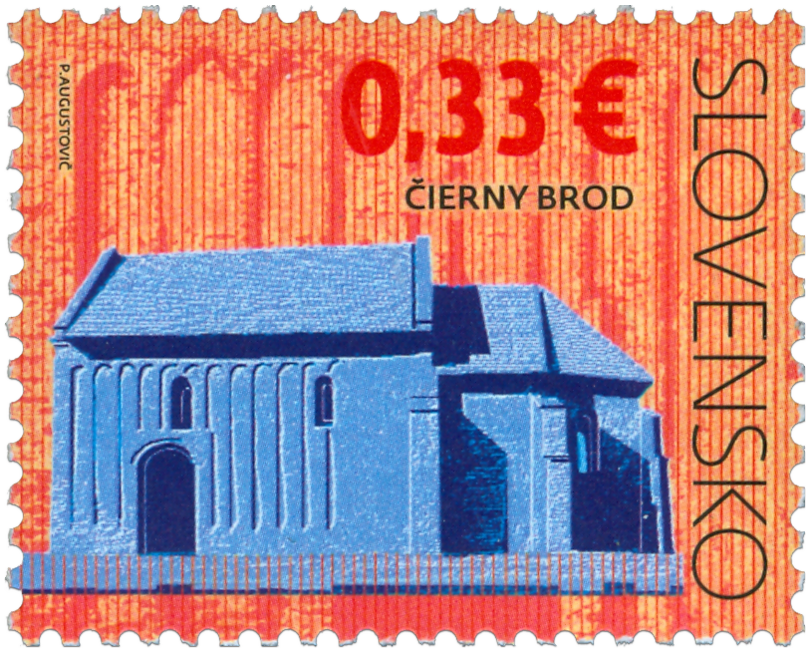 © Slovenská pošta, a. s., 2009 Osobitnú skupinu románskych pamiatok na území Slovenska tvoria tehlové stavby, rozšírené najmä v južných oblastiach. Patrí k nim aj Kostol Panny Márie v Čiernom Brode (časť Hegy), postavený v rozmedzí 20. až 30. rokov 13. storočia. Jednoloďová stavba s východným polygonálnym presbytériom bola viackrát prestavovaná a pôvodnú podobu jej prinavrátili až stavebné obnovy v 20. storočí. Vonkajší plášť lode členia lizény ukončené poloblúkmi tak, že po celom obvode vytvárajú hustý rad slepých arkád. Na južnej a západnej strane lode sa zachovali dva takmer identické portály, polkruhovo ukončené a s pravouhlým rámovaním. Nad západným portálom, v...