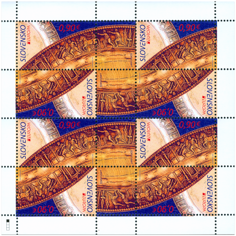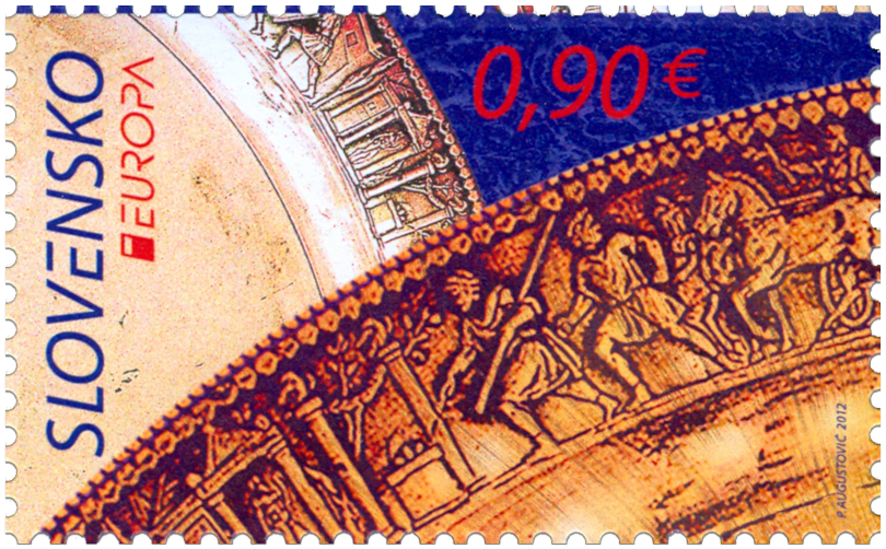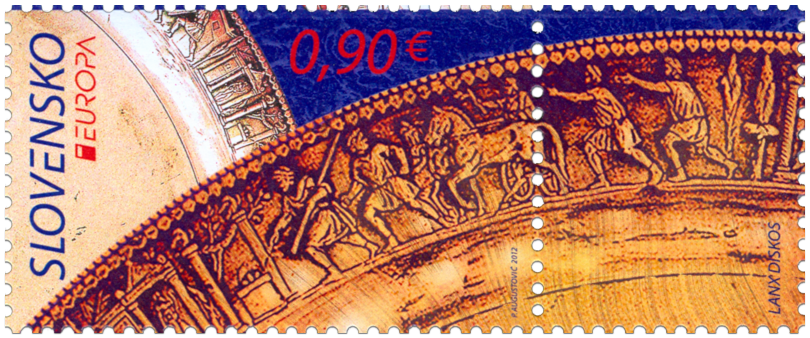 Na poštovej známke je zobrazená časť reliéfnej výzdoby rímskeho taniera, tzv. lanx diskos z 2. storočia po Kr., ktorý bol súčasťou výbavy náhodne objaveného hrobu germánskeho náčelníka v Krakovanoch pri ťažbe hliny v tehelni Stráže v rokoch 1933 – 1938. Strieborný tanier stvárňuje rôzne príbehy z počiatkov rímskych dejín, najmä udalosti späté s vyhnaním posledného etruského kráľa Tarquinia Superba v roku 509 pred Kr. Na známku bol vybraný výjav procesie kráľových synov Tita a Arunsa, ktorí putovali spolu so svojím bratrancom Luciom Juniom Brutom (na voze) do Apolónovho chrámu v Delfách po veštbu, kto bude po smrti ich otca kráľom. Pýthia...