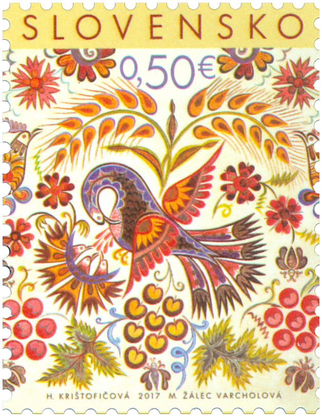 Veľkonočná emisia možno prekvapí netypickými motívmi a tematickým zameraním na ľudovú ornamentálnu maľbu. Zobrazené ornamentálne motívy vychádzajú z pôvodnej maľby ohnísk, ktorá patrí medzi najvýznamnejšie prejavy ľudovej maľby minulých storočí. Tvorba je obdivuhodná i tým, že pochádza výhradne od žien, gazdiniek, t.j. ide o nástennú maľbu neškolených ľudových umelkýň. V malokarpatskej oblasti sa táto pôvodne ochranná nástenná maľba interiéru kuchyne zachovala aj po zániku otvorenej kuchyne a samotného ohniska. V priebehu 19. storočia sa rozvinula do podoby bohatej ornamentálnej reprezentatívnej výzdoby interiéru domu. Vo Vajnoroch (dnes mestská časť Bratislavy) boli steny vstupnej siene zvyčajne vyzdobené charakteristickými poloblúkovitými kompozíciami pestrej farebnosti...