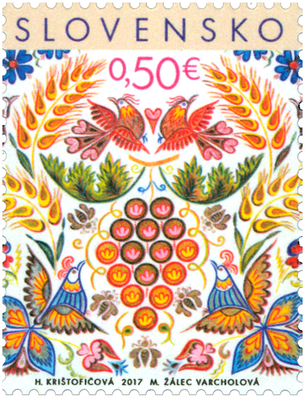 Motív viniča, obilné klásky, kvety, vtáky, včely i granátové jablká tak, ako ich nachádzame zobrazené v pamiatkach ľudovej nástennej maľby – to sú symboly, ktoré spolu s darmi prírody na sviatočnom stole aj dnes dotvárajú tradičnú vianočnú atmosféru. V emisii sú reprodukované maľby z Kostola Sedembolestnej Panny Márie vo Vajnoroch (dnes mestská časť Bratislavy). Je to jedna z mála do súčasnosti dochovaných pamiatok nástennej maľby, kde sa charakteristická ornamentálna ľudová maľba nachádza v autentickej podobe, avšak v neštandardnej situácii a v priestore netypickom pre ľudové umenie . Nástenná maľba má korene v dedinskom prostredí, kde sa z pôvodne účelovej maľby ohniska...