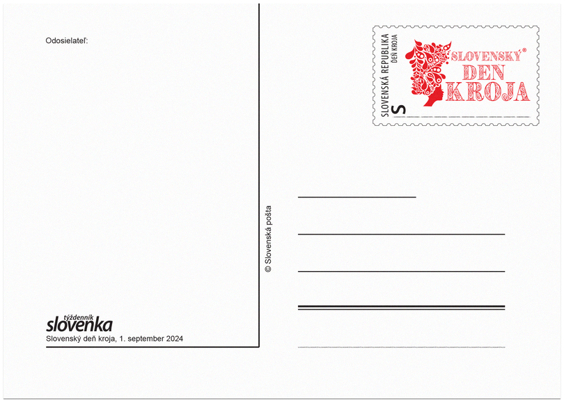 Pohľadnica má nalepenú komerčnú známku KZ 6 "Slovenský deň kroja II Logo.